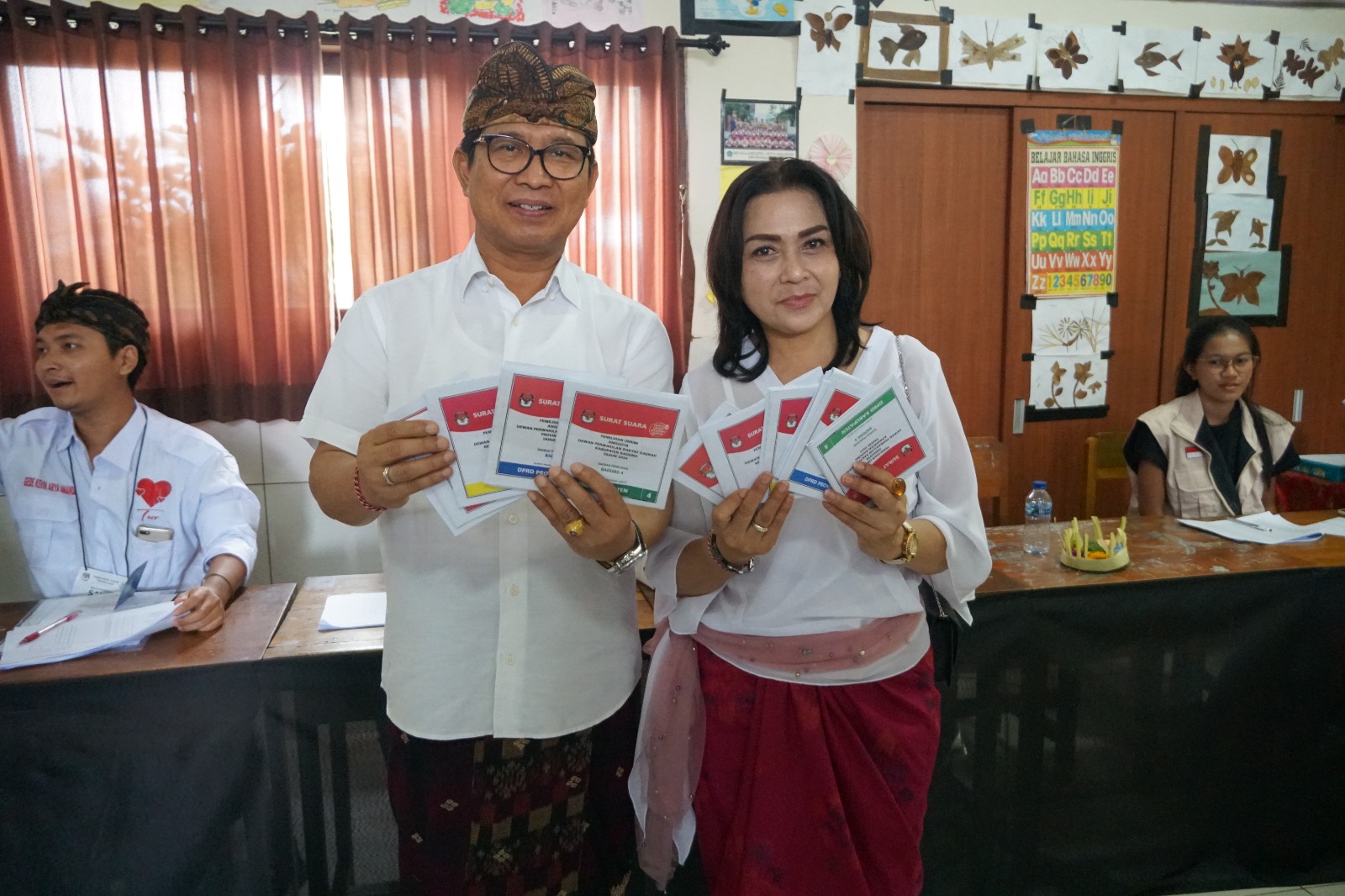 Sekda Adi Arnawa datang bersama istri Ni Putu Rasniathi pada pukul 10.40 Wita. Mengenakan pakaian adat Bali, Sekda Adi Arnawa berjalan santai menuju kotak suara dan terlihat memilih dengan telaten serta hati-hati, sementara sang istri dengan waktu yang singkat melakukan proses pencoblosan dengan cepat untuk lima surat suara Pemilu 2024.