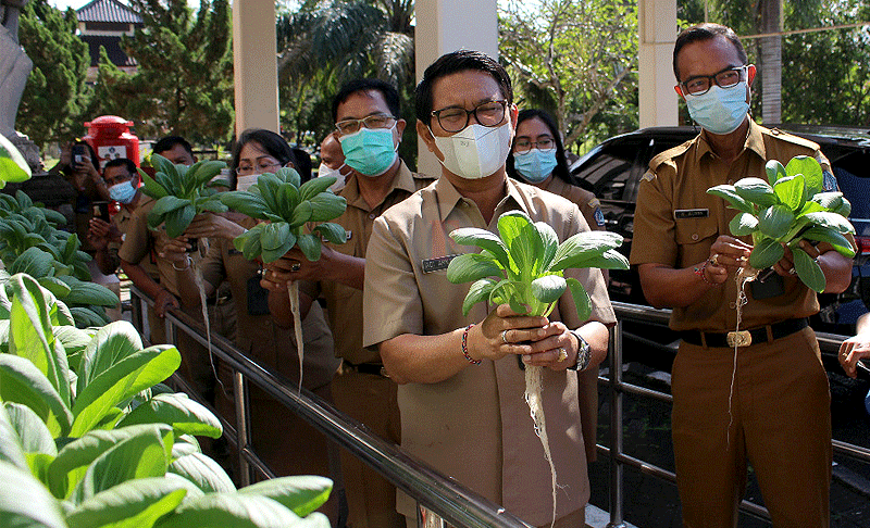 Majalahfakta.id – Sekretaris Daerah Kabupaten Badung I Wayan Adi Arnawa melakukan panen perdana sayuran Hidroponik berupa Sayur Pokcoy di lobi Kantor Dinas Pertanian dan Pangan Kabupaten Badung, Senin (03/5/2021).