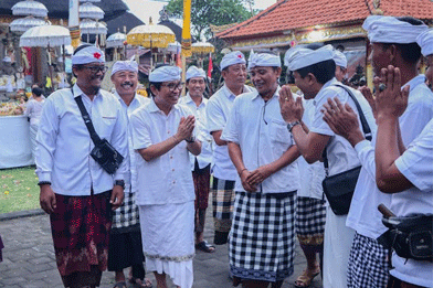 Sekda Badung I Wayan Adi Arnawa menghadiri sekaligus melaksanakan persembahyangan bersama dengan masyarakat saat acara Pujawali di Pura Dalem Penataran Mundeh Lingkungan Tegal Saat Desa Adat Kapal.