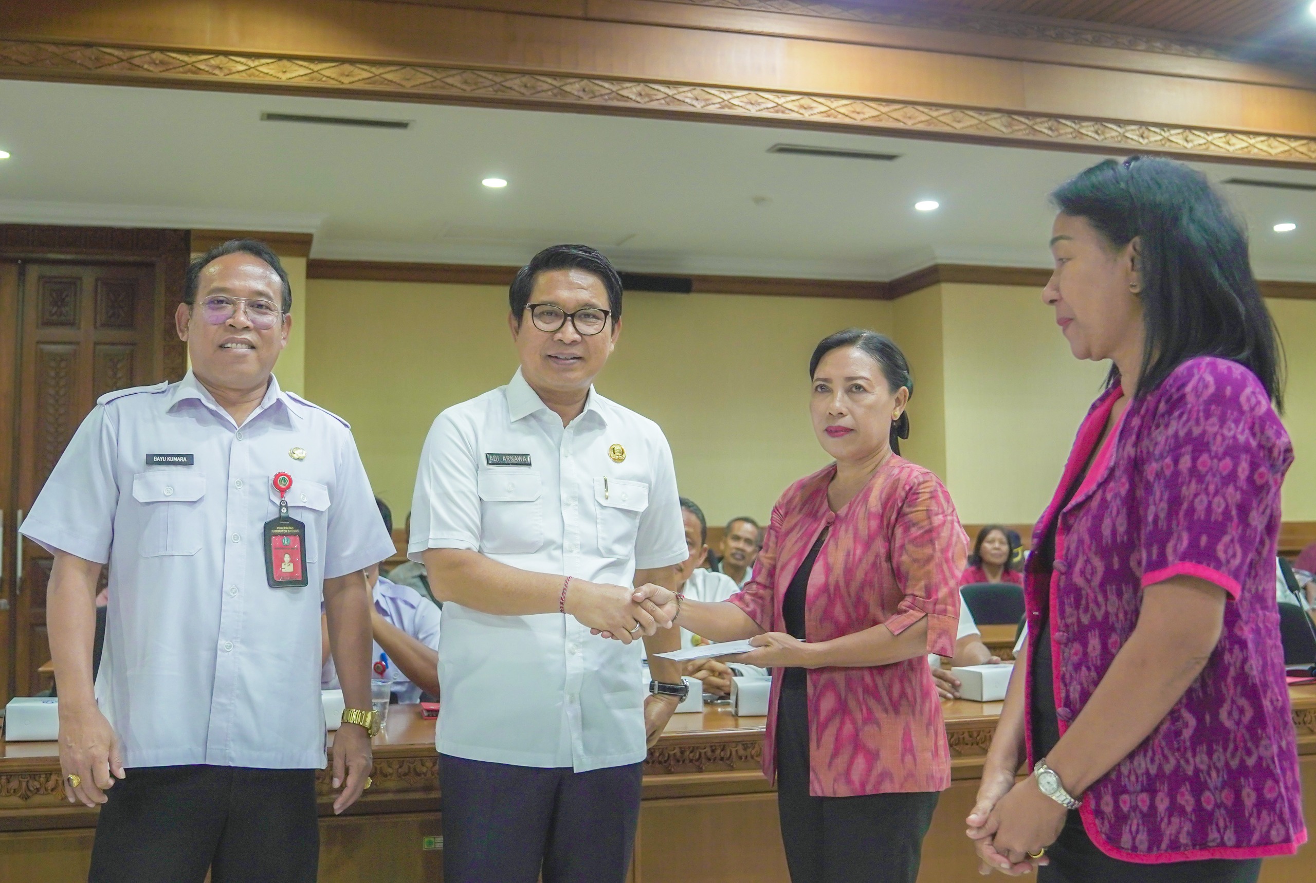 Sekda Badung I Wayan Adi Arnawa selaku Ketua Dewan Pengurus KORPRI Badung menyerahkan santunan kepada para anggota KORPRI yang telah purna tugas dan santunan kematian di Ruang Kriya Gosana, Puspem Badung.