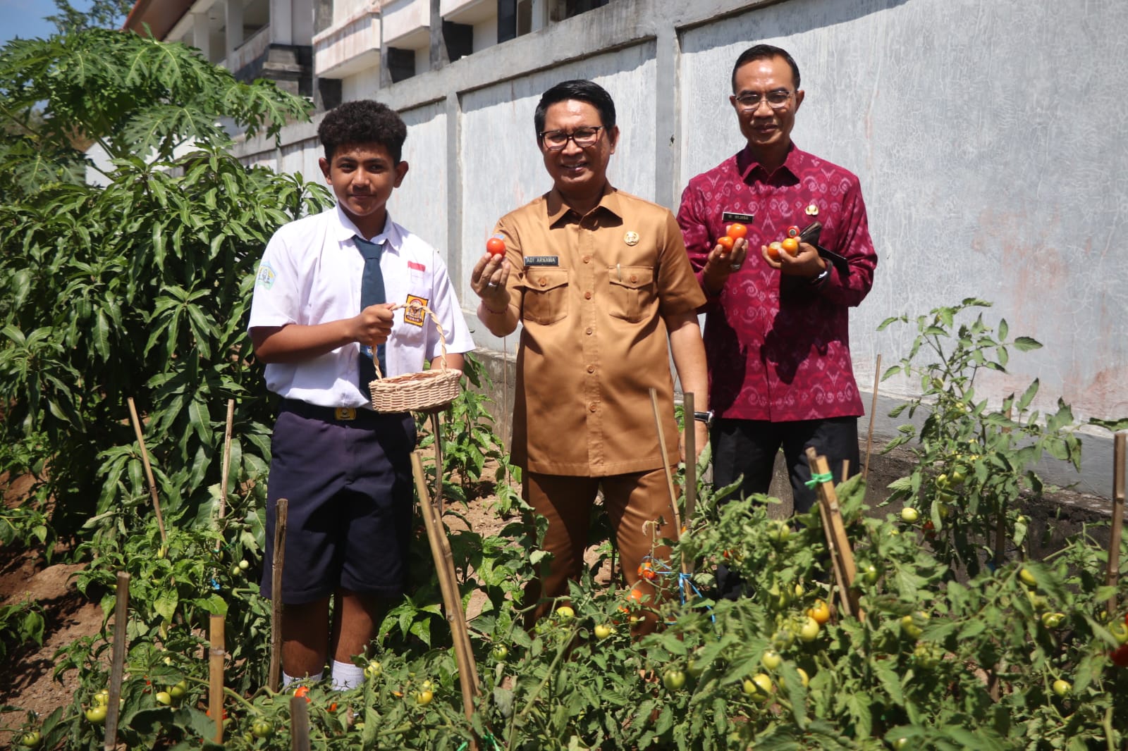 FAKTA – Sekretaris Daerah Kabupaten Badung I Wayan Adi Arnawa menghadiri acara panen perdana Program Siswa Belajar Bertani (Sibertani) SMPN 5 Kuta Selatan, Senin (20/11/2023). Pada saat itu Sekda Adi Arnawa yang didampingi oleh Kadis Pertanian dan Pangan I Wayan Wijana, Camat Kuta Selatan I Ketut Gede Arta melakukan panen cabe, tomat dan terong di kebun Sekolah SMPN 5 Kuta Selatan.
