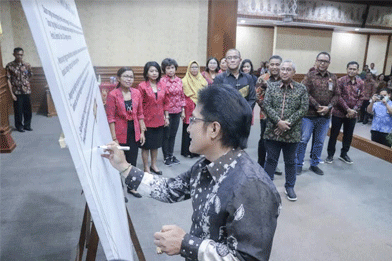 Turut hadir Ketua KPU RI Hasyim Asy’ari yang juga sebagai narasumber, Ketua KPU Provinsi Bali Dewa Agung Gede Lidartawan yang juga sebagai moderator, Ketua Bawaslu Bali, Ketua DPRD Badung.