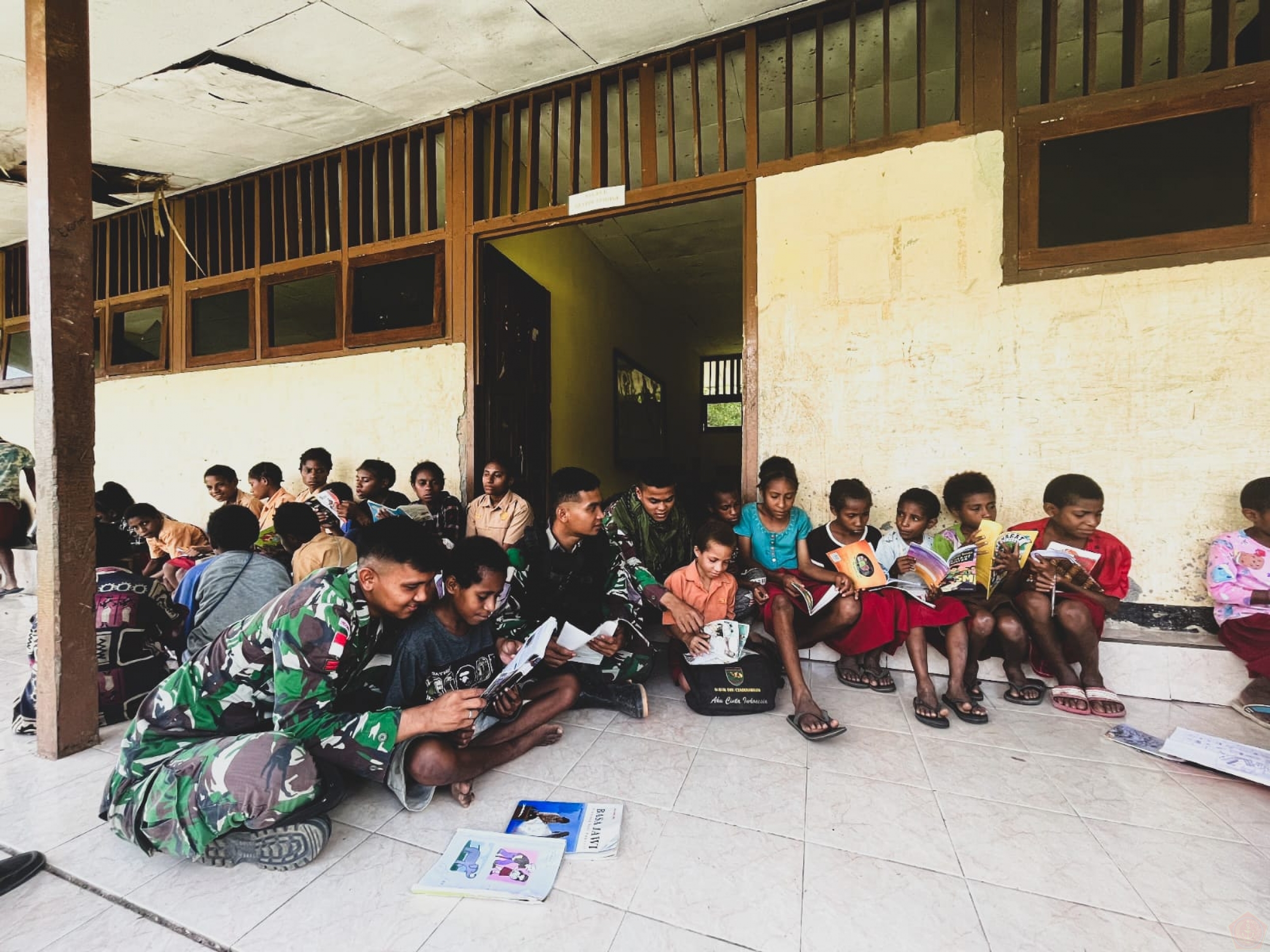 Cerianya Anak-anak Perbatasan Papua Disambangi Perpus Keliling Satgas Yonif 122/TS