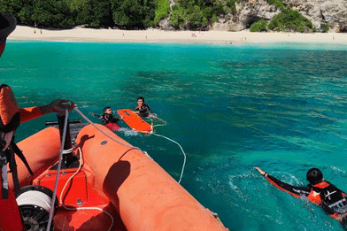 “Kita menurunkan 3 rescuer untuk berenang ke bibir pantai karena RIB tidak bisa sandar ke bibir pantai,” jelas Cakra Negara, Koordinator Unit Siaga SAR Nusa Penida.
