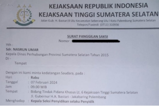 Dalam surat pemanggilan saksi HNU oleh pihak Kejaksaan Tinggi Sumsel sesuai dengan surat nomor SPS.05/L.6/fd.1/01/2024 tanggal 1 Februari 2024 yang dikeluarkan berdasarkan surat perintah penyidikan Kepala Kejaksaan Tinggi Sumsel No. Prin-05/L.6/Fd.1/01/2024 tanggal 23 Januari 2024.