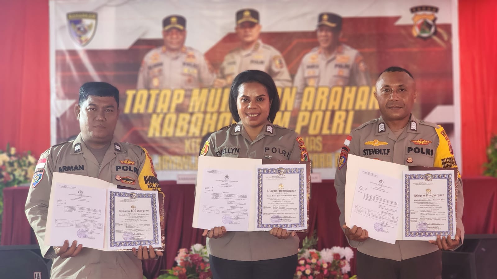 FAKTA, JAYAPURA – Tiga personel Polresta Jayapura Kota yakni Aiptu Arman, S.H., Bripka Steven Fenetiroma dan Brigadir Polisi Evellyn S. Krebru, S.H., terima Piagam Penghargaan Vicvapa Brahmagola dari Kabaharkam Polri Komjen Pol. Dr. Drs. H. Moh. Fadli Imran, M.Si bertempat di Aula Polres Jayawijaya, Jumat (13/10) siang.