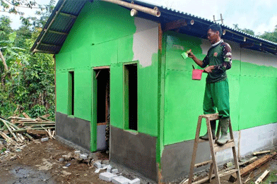 “Dinding rumah dicat dengan warna hijau kombinasi ala militer. Tujuannya agar rumah lebih berkesan sejuk, juga untuk menandakan bahwa warna itu hasil pekerjaan TMMD,” tandasnya.