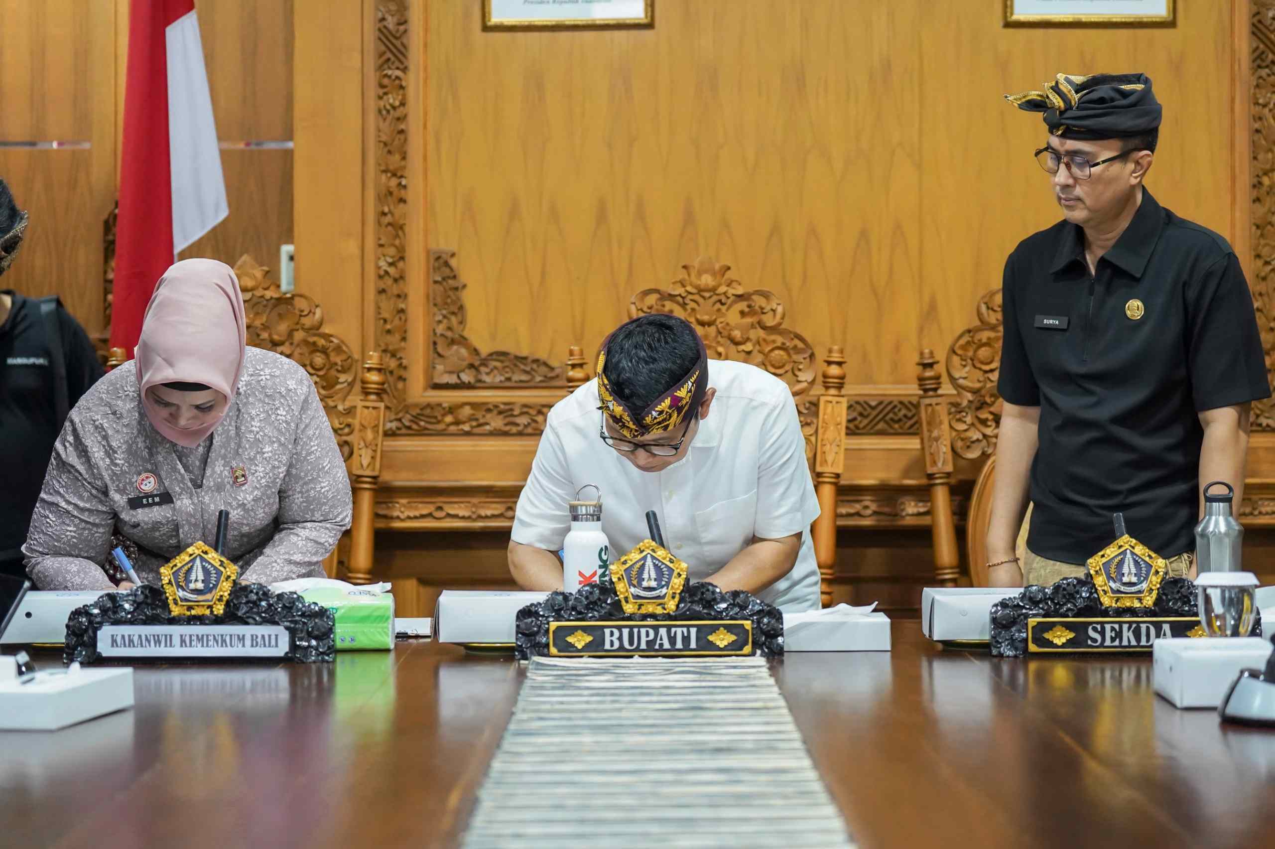 Penandatanganan kesepakatan dilakukan oleh Bupati Badung I Wayan Adi Arnawa dan Kepala Kanwil Kemenkum Bali, Eem Nurmanah di Puspem Badung, Kamis (11/9/2025). Dari Kanwil Kumham Bali hadir Kepala Divisi (Kadiv) Hukum I Wayan Redana, Kadiv. Peraturan Perundang-Undangan dan Pembinaan Hukum (P3H) Mustiqo Vitra beserta Perancang P3H. Dari Pemkab Badung hadir Sekda Badung IB Surya Suamba, Plt. Asisten Pemerintahan dan Kesra I Wayan Wijana, Kepala Brida I Wayan Putra Adnyana, Plt. Kepala BPKAD I Ketut Wisuda, Kabag Kerjasama IA Yutri Indahgustari dan Kabag Hukum A.A Gede Asteya Yudhya.