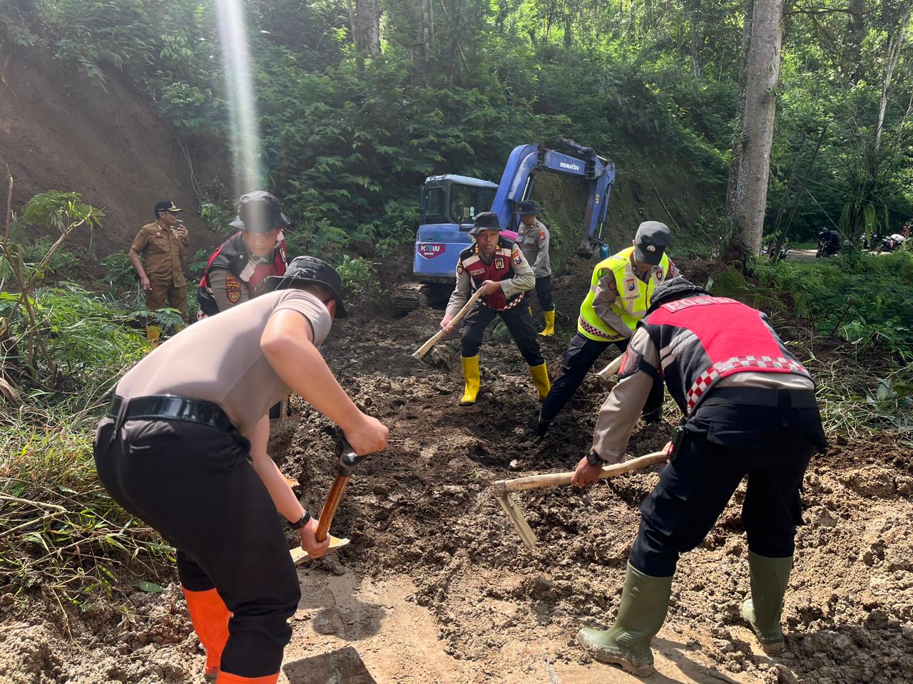 Dengan semangat kebersamaan dan kerja keras tim gabungan, pembersihan material longsor terus diupayakan menggunakan alat berat maupun secara manual.