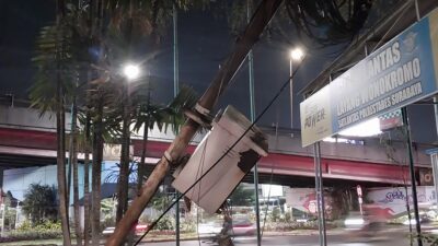 FAKTA, SURABAYA – Sebuah truck Kontainer nopol B 9174 TEJ menabrak kabel Telkomsel dan PLN di Persimpangan DTC Wonokromo, Surabaya. Rabu (4/10) sekira pukul 23.15 WIB.