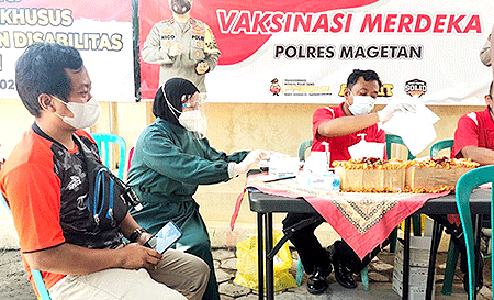 Turut hadir dalam pelaksanaan vaksinasi khusus difabel bertempat di Urkes Polres Magetan yakni Dandim 0408 Magetan, Ketua DPRD, Kejari, Ketua Pengadilan, Dinsos dan Dinkes Magetan.