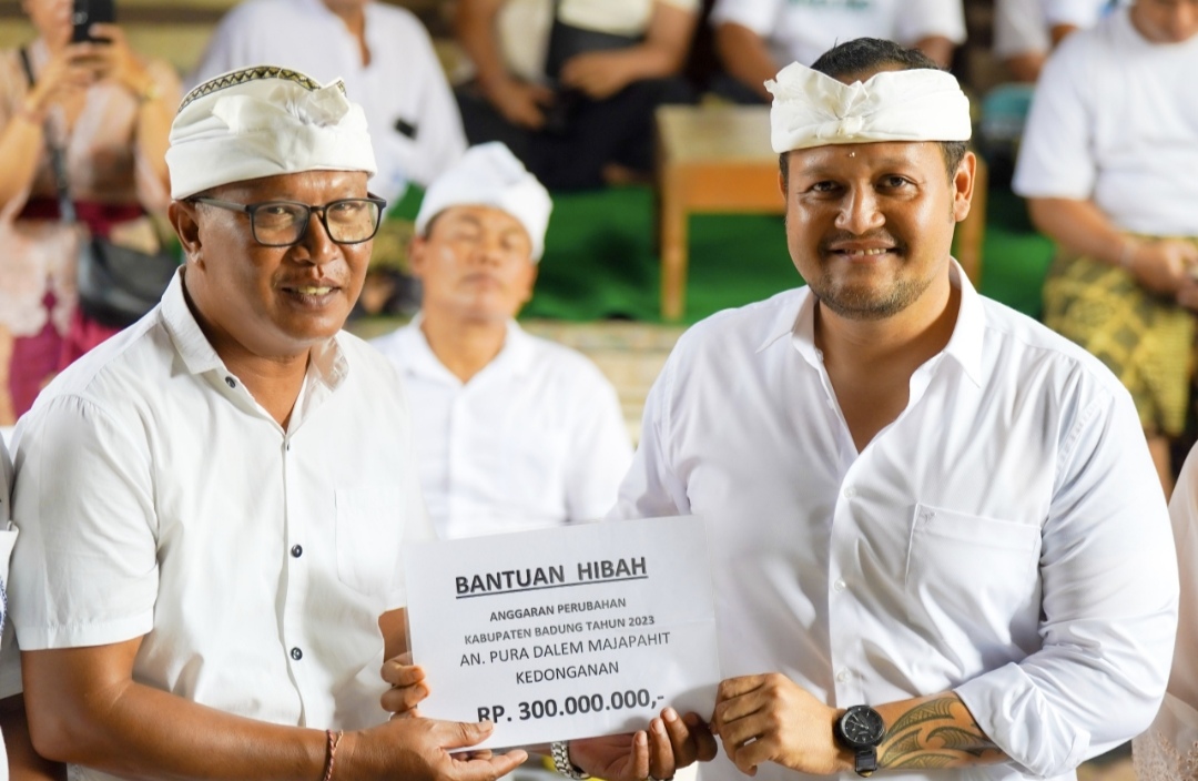 FAKTA – Serangkaian Karya Padudusan Alit, Ngelinggihang lan Mecaru di Pura Dalem Majapahit, Merajan lan Natah Tangkas Kori Agung, Br. Ketapang, Kelurahan Kedonganan, Wakil Bupati (Wabup) Badung, Bagus Alit Sucipta bersama Istri Yunita Alit Sucipta hadir melakukan persembahyangan bersama yang bertepatan dengan upacara pecaruan, Kamis (3/4/2025). Usai sembahyang, Beliau juga menyerahkan secara simbolis dana bantuan perbaikan pura sebesar 300 juta yang telah terealisasi. Selain itu menghaturkan dana punia sebesar 10 juta dan dukungan kepada Sekaa Gong Br. Ketapang sebesar 5 juta.