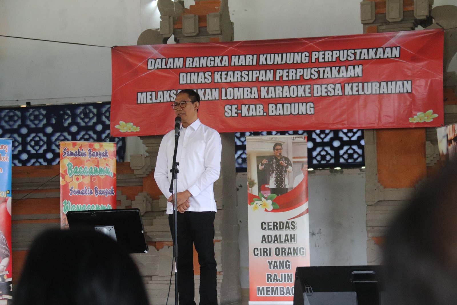 Wakil Bupati Badung I Ketut Suiasa menghadiri sekaligus membuka Lomba Karaoke Tingkat Lurah/Desa se-Badung yang diikuti oleh 21 orang peserta dalam rangka memperingati Hari Kunjung Perpustakaan Tahun 2023 bertempat di Wantilan DPRD Puspem Badung, Rabu (27/9). Lomba dengan tema “Peran Perpustakaan dalam Dunia Literasi Untuk Mewujudkan Pemikiran Visioner Tentang Perpustakaan Digital” ini turut dihadiri anggota Komisi IV DPRD I Gusti Agung Ayu Indah Trimafo Yudha, Kadis Kearsipan dan Perpustakaan yang diwakili Kabid Pengembangan Pembinaan dan Layanan Tjokorda Istri Mas Kartikawati, Kepala Badan Kesbangpol Nyoman Suendi, Perwakilan OPD terkait lingkup Pemkab Badung, perwakilan camat se-Badung, para Lurah dan Kepala Desa se-Badung, para Dewan Juri, Forum Anak Daerah Kab. Badung beserta undangan lainnya.