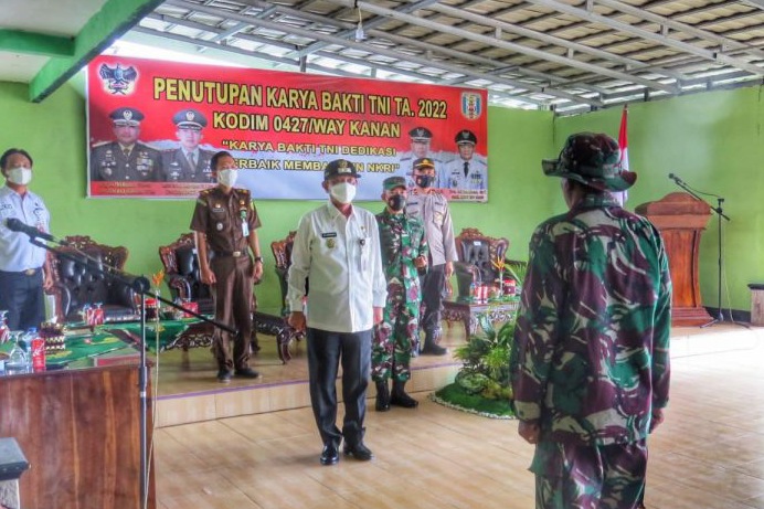 Majalahfakta.id – Karya Bhakti TNI Kodim 0427/WK Tahun 2022 di Kampung Bumi Ratu Dusun 5 Batu Dinding, Kabupaten Way Kanan, secara resmi ditutup wakil Bupati Way kanan Drs. H. Ali rahman, M.T. di aula Kodim 0427/Way Kanan, Kamis (11/6/2022).