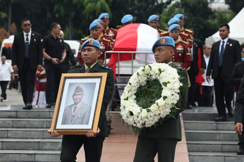 Prosesi pemakaman dilaksanakan secara militer dan dipimpin langsung oleh Presiden Prabowo Subianto sebagai inspektur upacara.