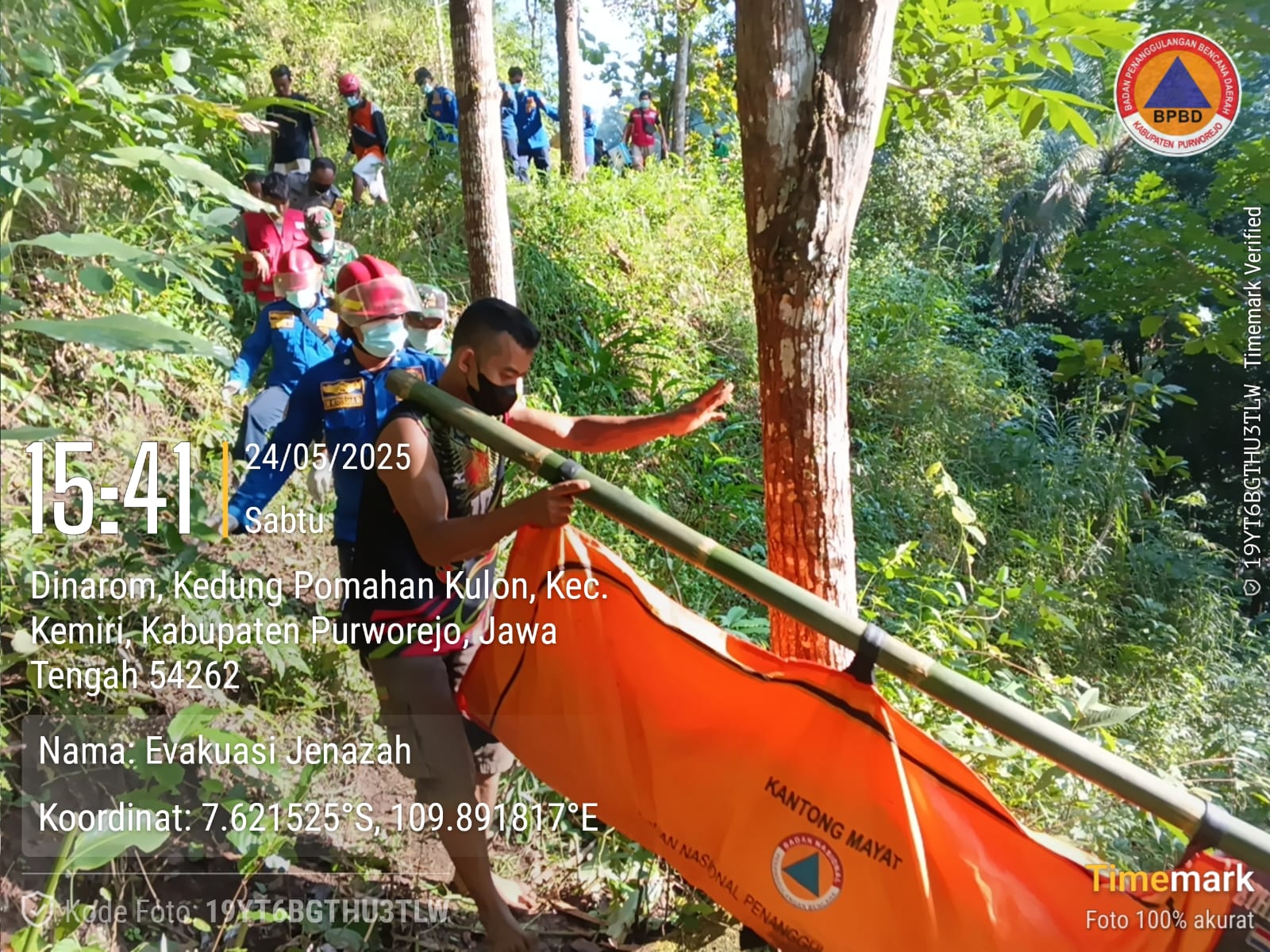 “Jenazah ditemukan di lokasi yang cukup sulit dijangkau karena medan yang terjal dan bukan merupakan akses jalan umum. Proses evakuasi dilakukan oleh 5 personel BPBD Purworejo yang dibantu oleh berbagai unsur relawan dan pihak terkait lainnya,” jelas Sutriman.