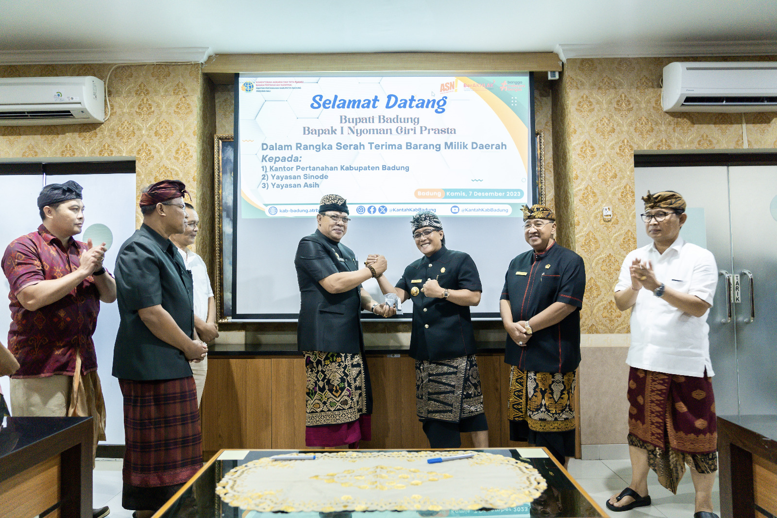 Bupati Nyoman Giri Prasta bersama Sekda Adi Arnawa menyerahkan hibah barang dan kendaraan kepada Kejaksaan Negeri Badung, Kantor Badan Pertanahan Nasional Kabupaten Badung, Yayasan Sinode dan Yayasan Asih, Kamis (7/12/2023).