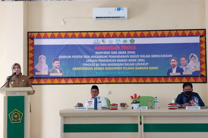 Majalahfakta.id – Kantor Kementerian Agama (Kemenag) Kabupaten Tulang Bawang Barat (Tubaba) melaksanakan Bimbingan Teknis Konvensi Hak Anak (Bimtek KHA) dengan Tema “Disiplin positif dan mekanisme penanganan kasus dalam mewujudkan Sekolah Ramah Anak (SRA)” tingkat Raudhatul Athfal dan Madrasah dalam lingkup Kemenag Tubaba di Aula PL – HUT Kemenag Tubaba, Kelurahan Panaragan Jaya Kecamatan Tulangbawang Tengah Kabupaten setempat, Senin (27/6/2022).